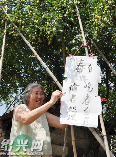 嵊州市鹿山街道浦桥村的这位大妈为防自家枣子被偷摘,不得已在枣树上挂了一块“枣子有毒”的纸牌。(来源:绍兴网)