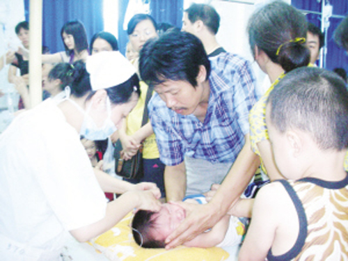 一进输液室,挂针处一个小病人吸引了记者的注意:婴儿头上已经被扎了好几针,正在挣扎着哇哇哭个不停;一位护士边按着婴儿的头,边寻找着新的“突破口”。“终于扎进去了,这已经是第4针了,看着针扎进去又拔出来,我真的心疼啊!”妈妈抱起儿子又是哄又是走:“我儿子的体质一向不是很好,昨天天气比较热,所以睡午觉的时候开了会空调,没想到晚上发起了高烧。”