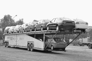 图为嵊州市禹兴停车场内被高速交警依法拦截的汽车“航母”。据高速交警二大队的一民警介绍,这是一辆私自改装的汽车装运车,其顶部改装后可一次增加7辆小轿车的运力,但危险也同步增长,属于明显的违法行为。目前交警正在处理之中。 (来源:绍兴网)
