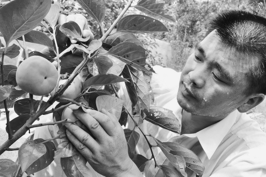 昨日,嵊州市仙岩镇一处名优水果基地里,农技人员正在观察从山东枣庄引种的鲜食甜柿。这种甜柿果型较大,市场上较为少见,在嵊州市也是首次引种成功。(来源:绍兴网)