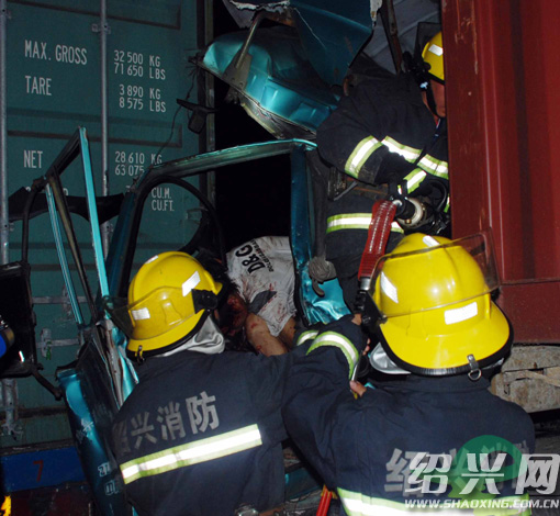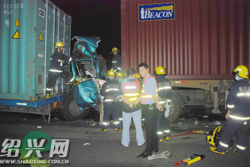 据河南牌照集装箱货车驾驶员吴某介绍,他从义乌运货到宁波,凌晨突然从车后传来了“嘭”的一声巨响,整辆车子都在颤动,当时就意识到被追尾了。于是,他立即将车子靠边停下,跑上去看个究竟,发现一辆宁波牌照集装箱货车撞上自己货车的尾部,里面还有两人被困,便急忙报了警。