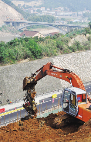 8月15日上午9时15分左右, 104国道清风桥路段发生我市历史上规模最大的山体岩质滑坡,当日下午4时,上三高速公路43K+300往上虞方向发生上三高速开通以来的最大滑坡。以最快速度抢险恢复通车后,有关部门抓紧时间进行清理除险。据悉,清风桥头滑坡的泥石有望在今天清理完毕,上三高速滑坡治理将于本月底全面完毕。图为昨日上午的施工现场。