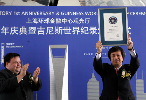 新华网上海频道8月28日报道:8月27日,游客在上海环球金融中心100层观光天阁内游览。环球金融中心100层观光厅开放一周年之际,“吉尼斯世界纪录”正式认证上海环球金融中心100层观光天阁为“世界最高观光厅”(认证海拔高度为477.96米);与此同时,位于上海环球金融中心79层至93层的上海柏悦酒店也获得“世界最高酒店”的吉尼斯世界纪录认证。
