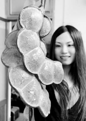 嵊州市艺术村里正展出一种豆荚有成人手掌大小的一种特大豆,据展示此豆的一位女士表示,这是“云豆”,但真正豆名却不得而知。图为在艺术村里展出的特大豆。 (来源:绍兴网)