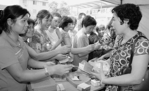 “创业信息服务一线行”摊位的人流量比其他地方要多。在嵊州市兴盛工艺绣品厂的摊位前,该厂厂长薛岳彩正在展示刺绣。她用绣品结交了许多妇女朋友,不少村民向她学绣品技术后在家门口挣到了钱,走上了致富路。薛岳彩表示,不少农村妇女由于要照顾家庭,不能外出上班,像这样的绣品,她们可以带回家,有空时拿出来绣绣,挣钱补贴家用,一般情况下,一人一月能挣400多元钱。