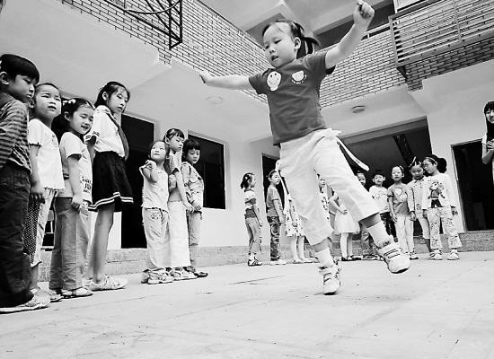 上午8点多,双菱校区教学楼前的空地上,左右用黄漆各画着两个格子。为了在昨天的开学典礼上跳好,前天,一年级的新生已经来集体练习过了。