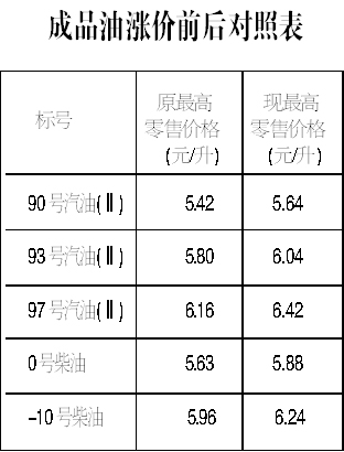 油价又涨了!昨天开始,有车一族加油得多掏钱。受国际原油价格上涨影响,9月1日晚,国家发改委宣布,昨天零时起国内汽柴油价格每吨提高300元,相当于汽柴油每升涨价幅度在0.22元至0.26元之间。 记者昨日从我市的中石化、中石油加油站了解到, 90号、93号、97号汽油零售价分别上调0.22元/升、0.24元/升、0.26元/升,0号柴油上调0.25元/升。 据了解,这是我国成品油价格今年第6次调整,第4次上调。