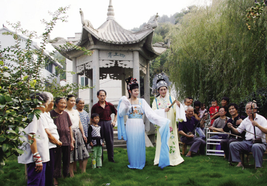 近日,在女子越剧发源地甘霖镇施家岙村宗祠前的“四工亭”,戏迷们穿起戏服用“四工调”进行了表演,让村民回味了80多年前施银花创造的“四工调”那优美的唱腔。