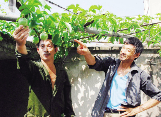 黄泽镇白泥坎村村民魏道尧5年前成功引种原产南美洲热带地区的百香果,经过几年研究,今年他又成功掌握了育苗技术,他选育的果苗已长出整串的百香果,引来我市百余位水果种植户参观取经。据悉,百香果又称“百果之王”,其果汁可散发出香蕉、草莓等十多种水果的浓郁香味。图为两位果农在参观。