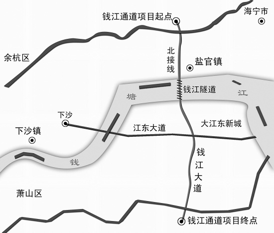钱江通道连接萧山和嘉兴,建成之后将连接沪杭、杭浦、杭甬、杭绍甬高速,打通了钱塘江的阻隔,是江苏盐城至绍兴高速公路的组成部分。钱江通道包括三大组成部分:南接线段(钱江大道)、钱江隧道、北接线段。其中南接线段和钱江隧道在杭州境内,北接线段在嘉兴境内。经过两市政府协调,基本明确了“一次规划、力争同步建成”的共识,初步计划2012年建成。