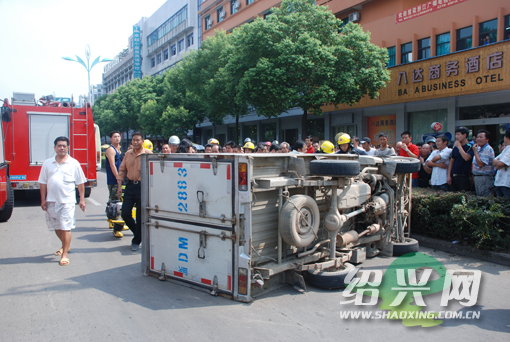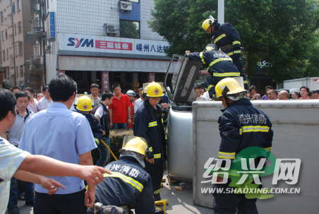 本网讯 今天上午10时许,嵊州市嵊州大道悦尔登大酒店路段发生交通事故,一辆箱式货车因避让不当撞上路边绿化带侧翻,司机受伤被困车内,右脚无法动弹,不时发出痛苦的呻吟声。经消防员紧急营救,成功脱险。