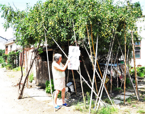 鹿山街道浦桥村的一位大妈,为了防止累累的枣子落地,用多根竹子支起了枣树枝;为防枣子被偷摘,还挂出了一张枣子“有毒”的纸牌。图为大妈正在张挂纸牌。