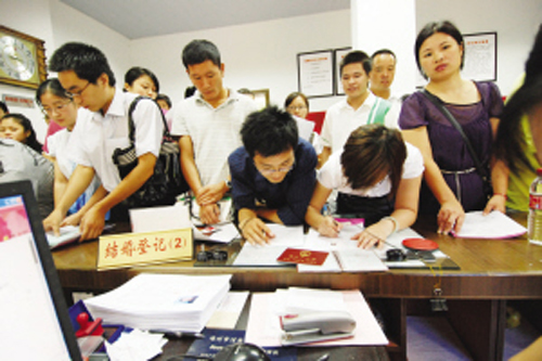 昨日是2009年9月9日,很多新人都去登记结婚。昨日上午9点左右,当记者来到市婚姻登记中心时,等候登记结婚的新人们已将队伍排到了马路上。婚姻登记中心的工作人员告诉记者,昨日结婚登记的新人仅次于去年8月8日奥运会开幕的那一天。