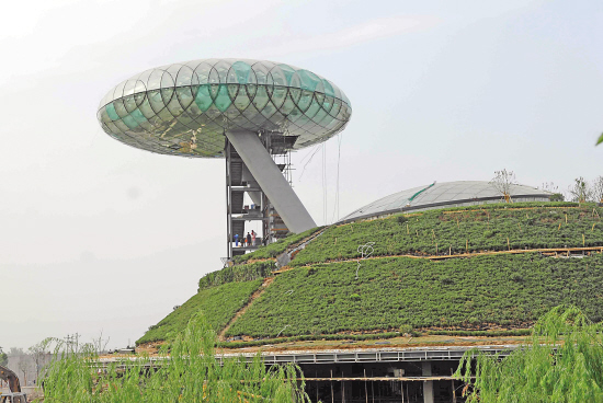 昨天,记者实地踏访了正在建设中的中国湿地博物馆。博物馆主体部分已经基本完工,工人正在铺装广场地面。主馆从远处看起来更像一个绿色的小山丘,植被覆满了整个建筑顶部。观光塔“小巨蛋”从主馆顶上斜冲出来,莹绿的玻璃外壳很具未来感,和周围满山满谷的草坪树木形成明显反差。