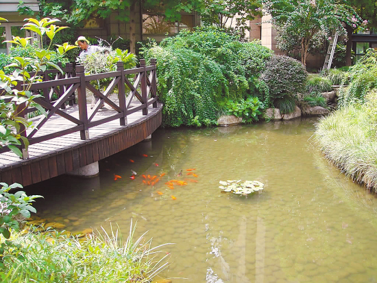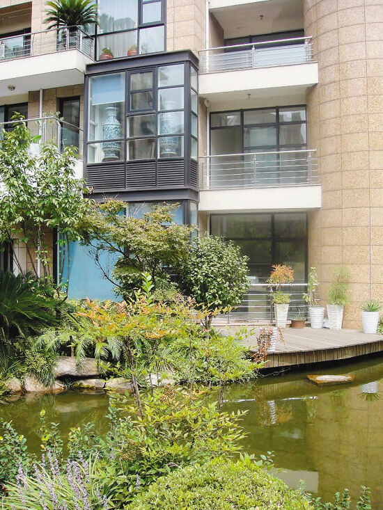 景观小品的设计非常精致,要知道这样的地段真正是寸土寸金,但这里的绿树红花还是绽放得那样铺天盖地。凡有楼盘空隙处,灌木、小桥流水、绿油油的草坪让人的目光应接不暇。那套总价2900万元的排屋,就位于一处水面的转角处。