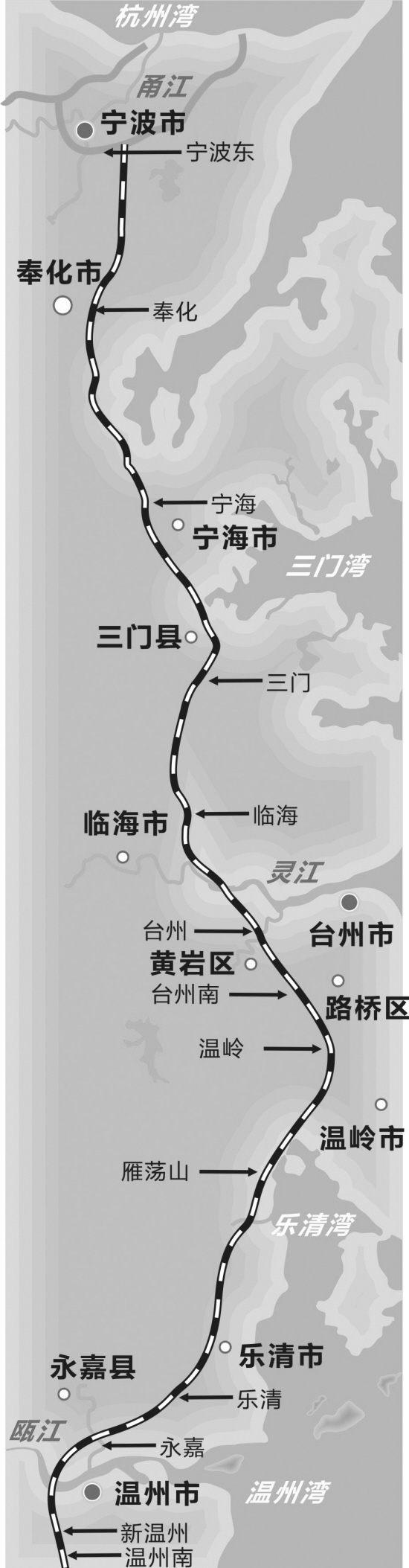 铁路从宁波站与既有的北仑支线并行至宁波东站,从宁波东出岔,经奉化、宁海,台州的三门、临海、黄岩、路桥和温岭,温州的乐清、永嘉、鹿城和瓯海,沿途将新建13个站点。
