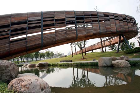 世博公园虽然是由一家荷兰公司规划设计,有着西方园林简洁、大气的特点,但重现“上海滩”景观、将江景“借”入公园,大量运用透水砖和地坪,桥梁和道路多用木材等手法,仍透出浓厚的东方园林思维,营造出人与自然亲近融合、“天人合一”的意境。
