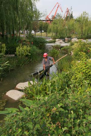园林工人正在世博公园里清理水中的青苔。新华社记者 任珑 摄影报道