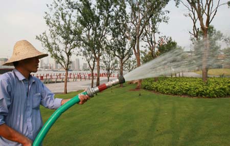 一位园林工人正在世博公园里浇灌草木。新华社记者 任珑 摄影报道