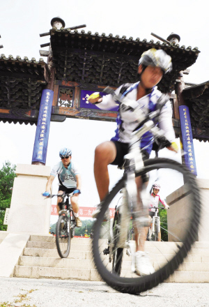 一年前,由我市百余名自行车爱好者发起成立的“177”车队,近日移师道家的洞天福地——新昌重阳宫,举行了石台阶骑车挑战赛。图为挑战赛现场。