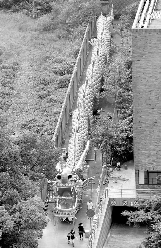 浙江在线09月14日讯 这几天,杭城不少市民都在传说一条“巨龙”:一颗牙齿有半人高;一眼望过去都看不到龙尾……经过打探,记者得知,这条巨龙暂盘踞在省老年大学校园旁边的一条巷子里,总长80米、身高6.2米、龙头直径5米。