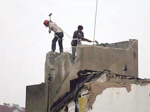 工人已在拆除倒塌的5号楼。 陆海云 摄