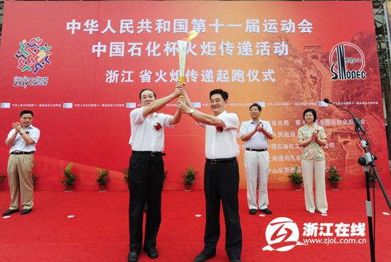 8时30分火炬传递活动开始。黄坤明部长点燃了第十一届全运会火炬,并宣布中华人民共和国第十一届运动会中国石化杯火炬传递活动浙江省火炬传递开始。