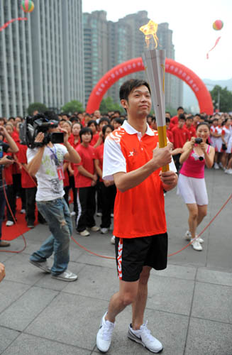 奥运冠军朱启南手持火炬开始传递 (新华社记者 徐昱 摄)