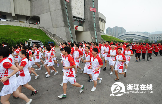 在主火炬手、我省著名教练员朱志根、著名运动员朱启南、杨雨、赵莹莹的带领下,2000余名群众参加了火炬传递活动。