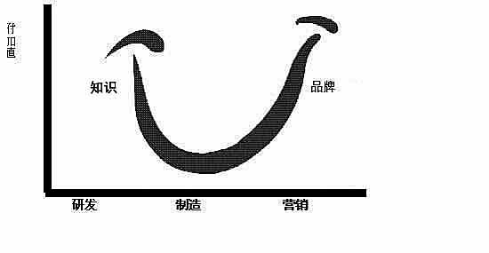 “微笑曲线”分成左、中、右三段,左段是技术,中段代表制造,右段为品牌。微笑曲线在中段位置说明获利低,而在左右两段位置说明获利高,整个曲线看起来像是个微笑符号。