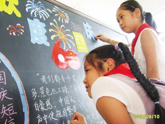 为迎接新中国诞生60周年,长乐镇中心小学开展了“共产党好,社会主义好,伟大祖国好,改革开放好,各族人民好”主题系列活动。图为少先队员在绘制“祖国颂”黑板报。