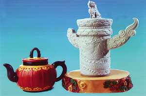 日前,崇仁民间陶艺家、工艺美术师张明瑜特地创制了两把陶艺壶——“祖国寿诞壶”和“祖国欢庆壶”,向祖国60周年华诞献礼。祖国寿诞壶雅致而和美,茶壶形态巧妙地融合在“华表”的外形中,使这把茶壶升华到一个新的艺术高度;祖国欢庆壶华丽而热烈,茶壶外形巧妙地融合在大红灯笼的造型中,扁圆的朱红壶体是灯笼的外形,隐隐露出灯笼的骨架,增添了装饰味。