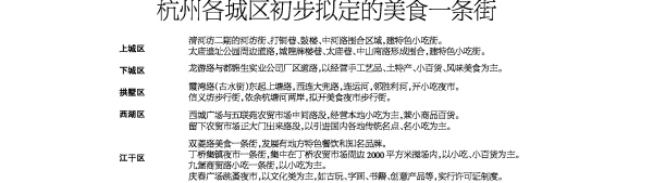 5个主城区,初步拟定了11条候选美食一条街,滨江区也考虑建室内大排档美食城——
