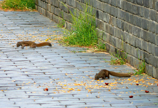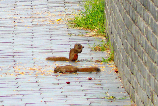 随着市区绿化环境的日益改善,平时只在山上偶有见到的松鼠将地盘拓展到了市区繁华地段的古城墙上。图为笔者20日晨在城市广场边剡城古城墙西段拍摄到的成对松鼠觅食的场景。