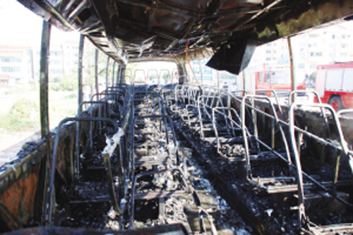 当日上午8时20分,市消防大队接到报警后,迅速出动1辆水罐车、8名指战员火速赶往现场。此时,停靠在路边的客车已被火焰包围,油箱部位已蹿出火苗,随时可能发生爆炸,情况万分危急!指挥员当即下令:一组队员出两支水枪,从左右两边实施扑救;一组队员疏散围观群众,防止发生意外。经过消防官兵近20分钟的扑救,火魔终于被降伏。