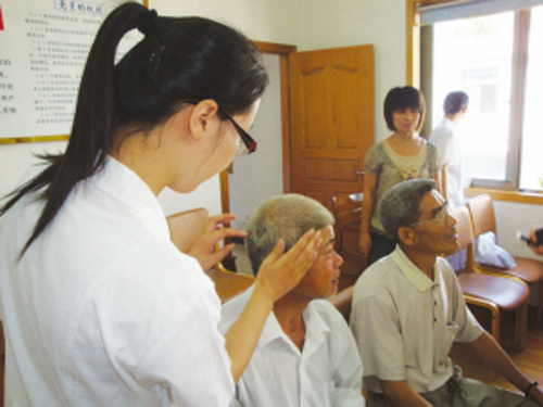 昨日是第52届“国际聋人节”,当天,市残联向听力残疾人免费赠送了100台高档助听器。图为工作人员为崇仁镇应桂岩村听力残疾人应惠才调试助听器。