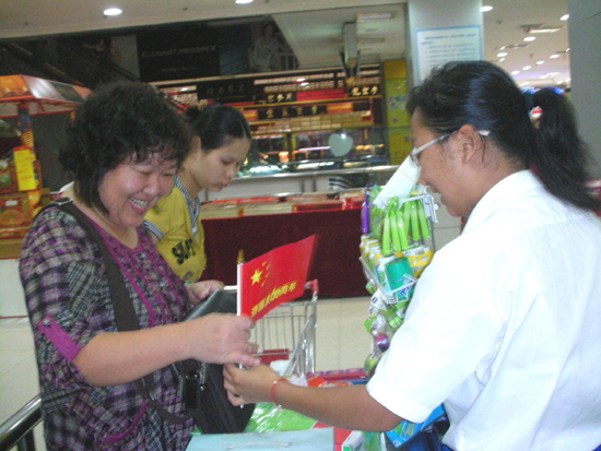 据国商大厦有限公司相关负责人介绍,在国庆60周年到来之际,公司一直在思考用什么方式向祖国祝寿,日前,市委宣传部发起的让“五星红旗升起来”活动,正好合了他们的心意,于是他们马上筹备了1000面国旗,向市民免费发放,为国庆日的喜庆气氛助威助力。这位负责人同时认为,企业参与这样的活动对员工也是一种爱国教育。