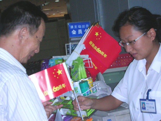 在派送现场,记者注意到有一家三口来购物的市民,他们要了三面五星红旗后说,一面代表一个人对祖国的祝福。一位正在派送的营业员表示,去年奥运比赛现场的气氛让她备受鼓舞。“祖国60华诞马上要到了,我同样非常激动!”