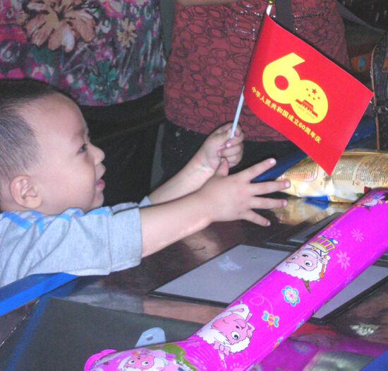 刚上幼儿园小班的小楠楠今天一早跟着妈妈去国商超市购物,在结账时,小楠楠获得了一份特别的礼物——一面鲜艳的五星红旗。据悉,为庆祝新中国成立60周年,国商大厦有限公司精心准备了千面红旗免费赠送给来购物的市民。
