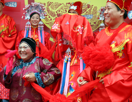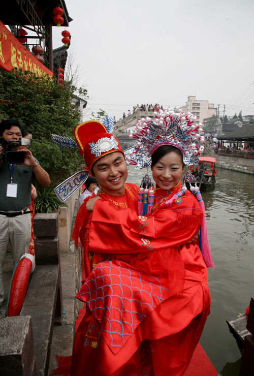 20对来自“吴越故地”(江浙沪)、身着古代婚服的新婚佳人,分别在古镇“吴越广场”婚典舞台和婚嫁喜船上,接受人们的真挚祝福。新人们还在象征缘分、圆满和吉祥的“天下第一桌”旁,喝交杯酒,吃莲心汤,品尝吴越传统婚宴。