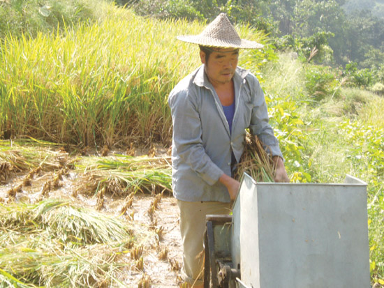 60岁的村民马维初大清早就顶着露水出工了,一绺田,也就巴掌大一块。他一个人割稻,一个人打稻,到中午就割好了。马维初说,家里有十来块这样大的田,除国庆节、中秋节两天过节外,其他的日子,都得趁好天气早点收割,不然,山里野猪多,说不定这么好的粮食要被糟蹋光。