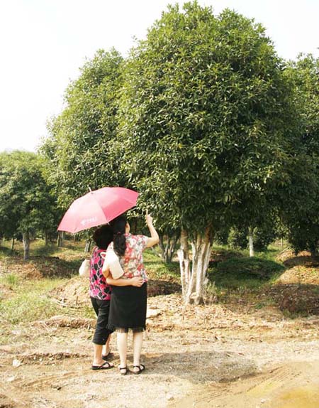 “十一”期间,正值中秋佳节,众多市民自驾车来到黄泽前良百年桂花林赏桂花。图为两位青年女子在品赏桂花的情景。