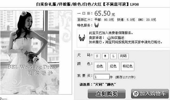 据介绍,一些做定制生意的店主要做小礼服、长款晚礼服、婚纱,而根据款式的难易度和面料的价格,最便宜的小礼服两三百元,而贵的婚纱礼服则是上千元。一个叫“开心飞翔2008”的店主告诉记者,网里专做定制服务,只要顾客报上三围和身高,再选择店里展示的明星礼服样式,买家下单10天内就可以拿到货,仿真度达到九成。“如果收到不合身,2天内还可以发回来改,改不收费,运费各出一半。”