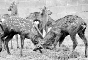 昨日,嵊州鹿胎山鹿业有限公司的养殖基地内,两只成年梅花鹿为争鹿王宝座“大打出手”。