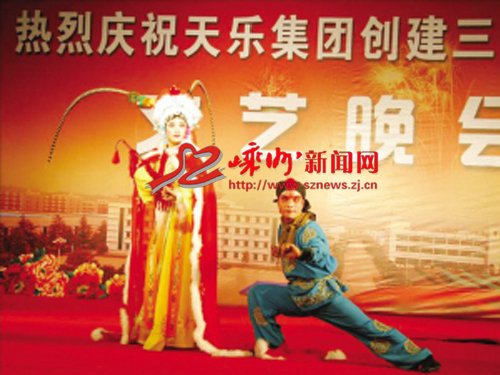 为庆祝天乐集团创建35周年,10月10日,天乐集团精心准备的晚会在蛟镇中学上演。整台晚会高潮迭起,越剧、魔术、舞蹈等形式多样的表演使大家深深陶醉。图为晚会现场。