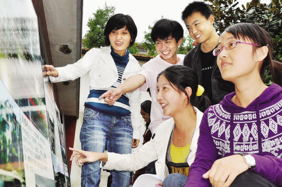 嵊州市贵门乡大学生“村官”利用休息时间,自发对全乡10个行政村的新面貌和文物古迹进行摄影采风,用图片的方式集中展示,供全乡父老乡亲观看,感受新农村建设带来的变化。图为昨日图片展出现场。 (