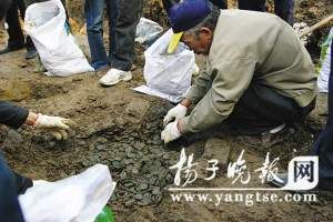 扬子晚报10月16日报道 13日上午11时许,位于(江苏)淮安市清河区长安街道越河小区拆迁工地上,一拾荒老汉在房屋早已变成废墟的屋基地上“捣鼓”时引起工地上工人注意。工人发现,该老汉正在地上一个小坑里捡铜钱。于是工人立即报警,公安、文化等部门迅速赶到现场,截至13日下午4时许,该市博物馆考古人员已在地下找到两个铜钱的掩藏点,后经清点,这些铜钱为清朝晚期至民国早期,大多品相完好,大约有十五六万枚。目前,这批铜钱已被运至该市博物馆作进一步研究。