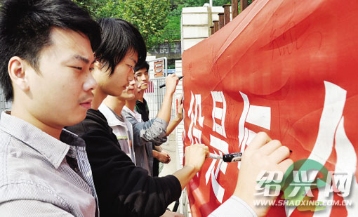 日前,嵊州市征兵体检站里,主动报名参军的100余位大学生举行了征兵签名活动。前来应征的大学生们在“依法服兵役是每个公民应尽的义务”的横幅上签名。(