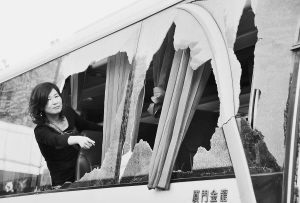 司机俞某告诉记者,当时,他途经公路的一个转弯处,发现前方路面上有一堆石头,于是下车搬石头。当他停车准备打开车门时,突然从山坡上飞来多块石块,车门和两个车窗的玻璃都被砸碎。有一块石块还落在车里,这块石块长约30厘米、宽18厘米、厚10厘米左右。幸好当时车上没有旅客,随车导游也没有坐在前排位置,否则后果不堪设想。