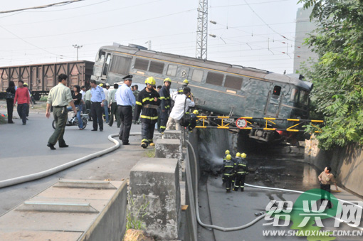 接到报警后,越城消防大队立刻出动了五辆消防车赶赴现场。笔者在到达现场后看到,出事火车车头的前半截刚好挂在了铁路桥下,车头处的柴油箱正在漏油,桥洞下一辆负责清洁的小三轮车已被撞毁。
